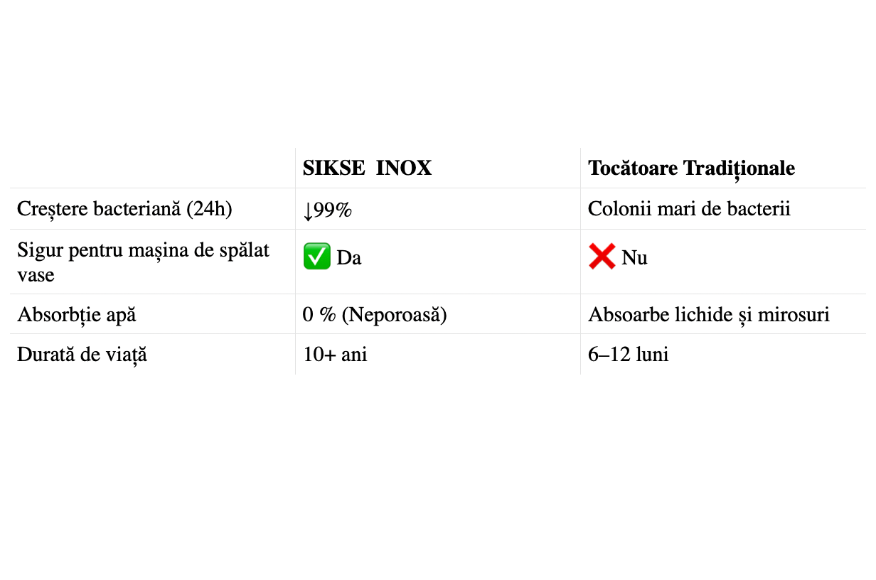 Tocătoarele din oțel inoxidabil sunt superioare celor din plastic și lemn. Spre deosebire de cele din plastic, care pot elibera substanțe nocive, și cele din lemn, care rețin umezeala și pot dezvolta mucegai, tocătoarele din inox sunt igienice, ușor de curățat și mai durabile. Alegerea ideală pentru o bucătărie sănătoasă!